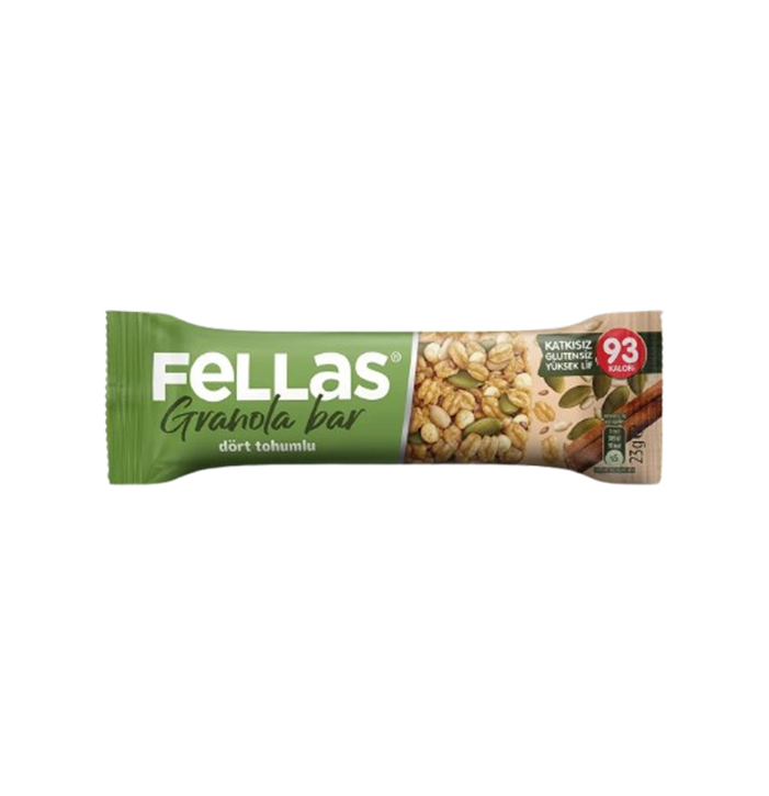 Fellas Dört Tohumlu Granola Bar; ay çekirdeği, chia, keten tohumu, kabak çekirdeği ile zenginleştirilmiş granola karışımıyla hazırlanır. Şekeri yalnızca meyvelerden gelir ve her lokmada tohumların zengin lezzetini hissettirir.