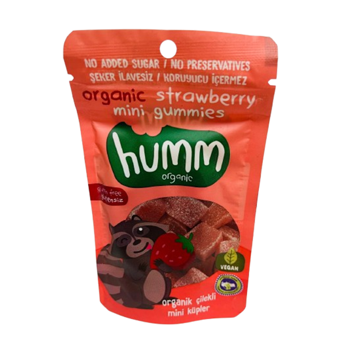 Humm Organic Organik Glutensiz Vegan Çilekli Mini Küpler, meyveli atıştırmalıkları sevenler için mükemmel bir tercihtir. Bu mini küpler, organik çilek püresi, organik pirinç unu gibi doğal ve besleyici içeriklerle hazırlanmıştır. Bu lezzetli sağlıklı atıştırmalık glutensiz, vegan ve şeker ilavesizdir, renklendirici ve koruyucu içermez.